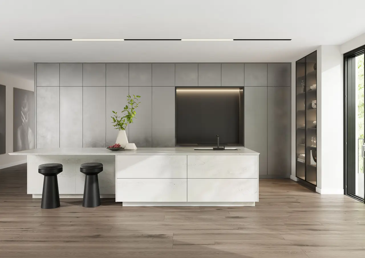 Subtle honey shading adds warmth and depth to a serene, cool white background while soft taupe veins gently melt into the organic surface.