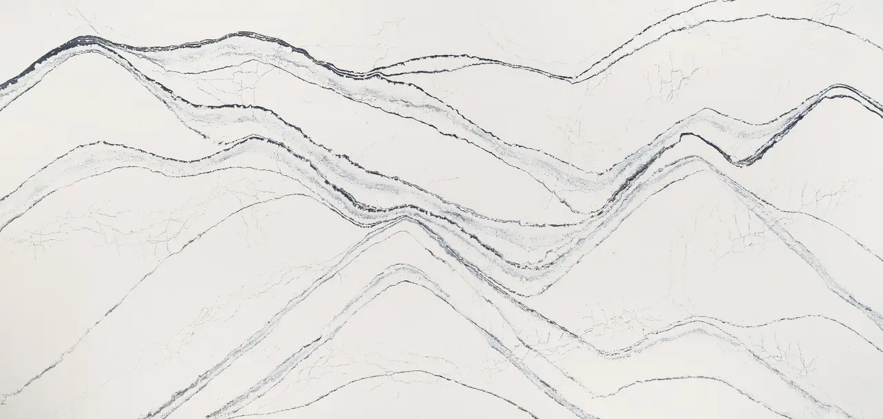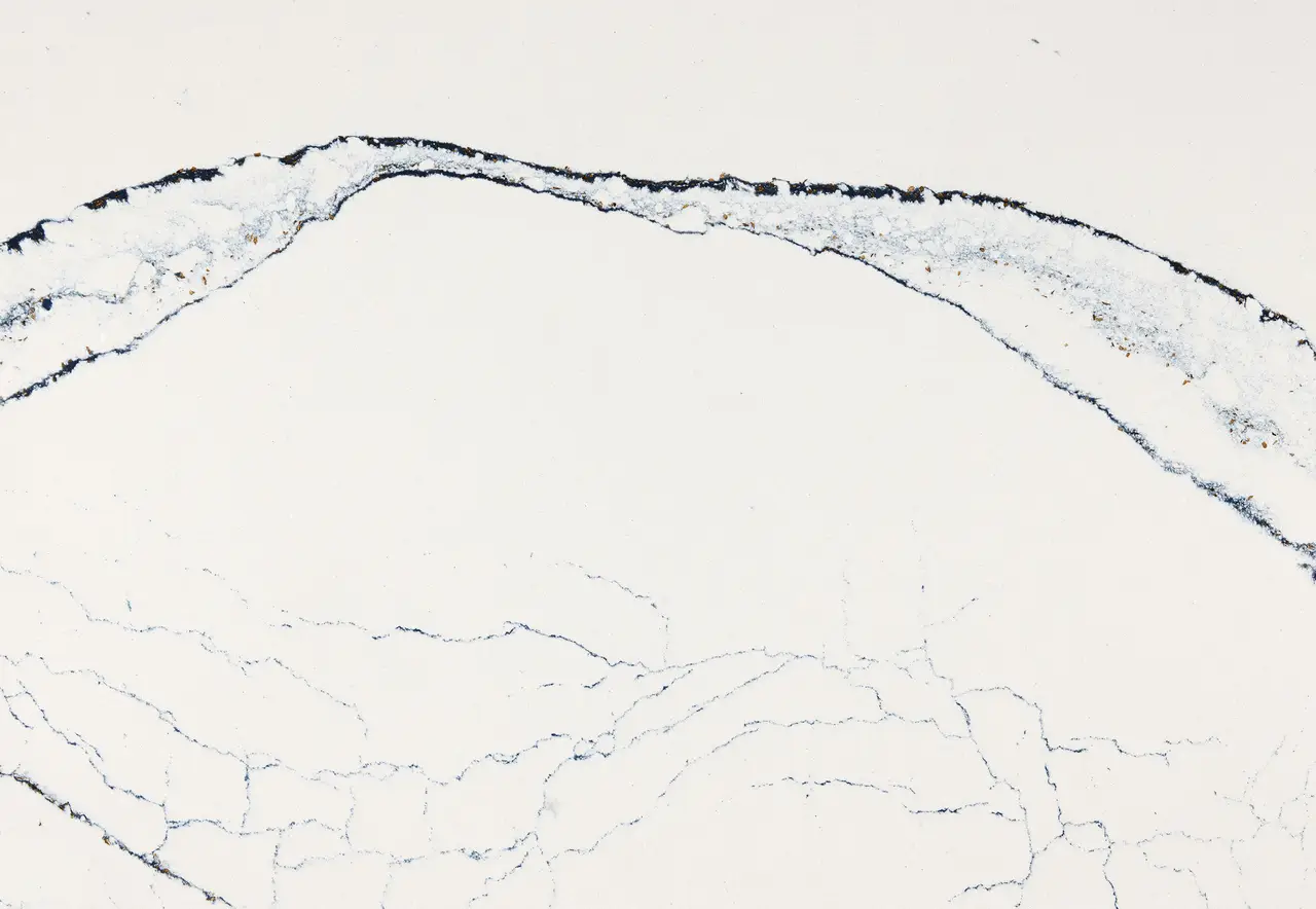 Portrush features an elegant creamy white base crisscrossed with bold navy, gray, and black veins accompanied by finespun filaments and gleaming gold flakes.